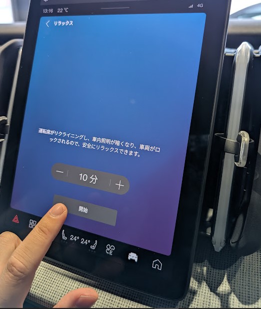 先ずは電源オン状態で常に光るイルミネーションが暗くなり、シートが何と休憩し易い様に自動でリクライニングにしてくれるのです。更に安全を確保するためにドアロックもしてくれます。