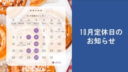 いつもボルボ・カー江戸川のHPをご覧いただきありがとうございます。📅定休日のご案内 10月の営業カレンダーをご案内させていただきます。 【 水曜日定休日および、7日・21日の火曜日 】 営業カレンダーにて ご確認お願いします。皆さまのご来場...